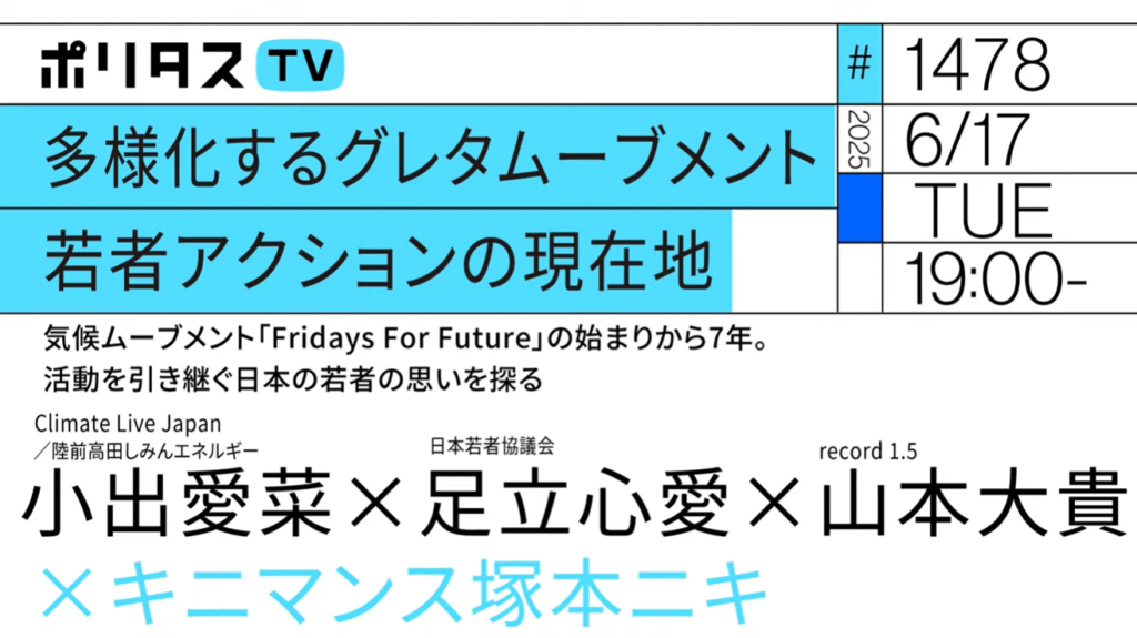 2025年4月より、YouTubeチャンネルポリタスTVとのコラボ企画を開始し、キニマンス塚本ニキとrecord 1.5代表の山本大貴によるダブルMCで定期的な配信を行っています。若者団体や専門家を招き、日本のエネルギー政策や気候変動枠組条約締約国会議であるCOPなど、気候変動に関する重要テーマを中心に発信しています。